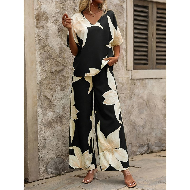 2025 Summer Set Printing V-Neck Bat Sleeve Blouse Long Pants Fashion Two-Piece HZ1208